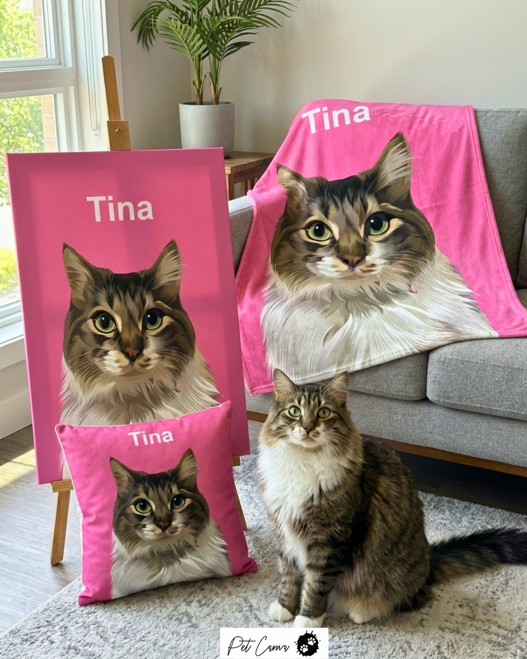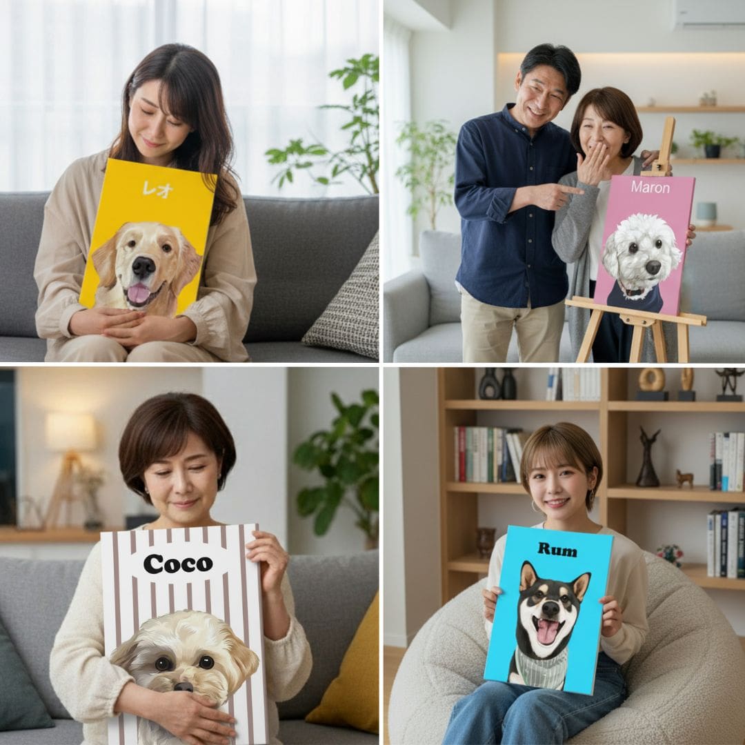 PetCanvaのペットポートレートは、お部屋を彩るポップアート♪壁のギャラリーのメインアートにしたり、おしゃれな棚においてお部屋のアクセントにしたり、ペット好きのご家族やお友達へのギフトにもぴったりです!