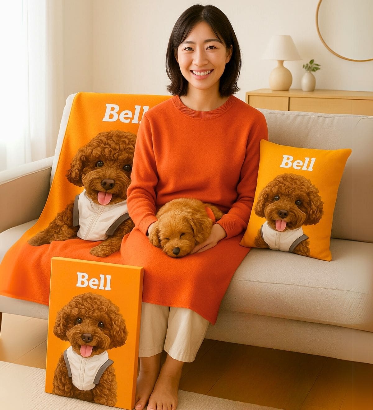 35×35cmのスクエア型。ベルベットのような高級感ある手触りで、快適さと上品さをお部屋にプラス。愛するペットのポートレートをスタイリッシュに引き立てます。